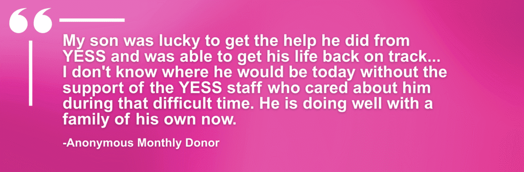 As the year comes to a close, your generosity can create a brighter beginning for youth in crisis. When you give to YESS, you’re helping provide warmth, safety, and belonging to young people who need it most.